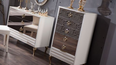 Elite Yatak Odası Takımı alışılmışın dışında bir çizgiye sahip olup, modern ve klasik çizgilerin birleştiği avangart tasarımı ile üst düzey tasarıma sahip bir üründür. Elite Yatak Odası takımı, tüketicilerimize görsel zenginliğin yanında işlevselliği ve fonksiyonu da beraberinde sunacak bir takımdır. Birbirini tamamlayan altın renk uygulamaları, farklı tasarıma sahip ayak yapısı, ünite kapakları üzerinde yer alan bronz renkli aynası ve şık kulp detayları ile görsel açıdan zenginleştirilmiştir. Takım renk konfigürasyonunda genel itibariyle beyaz renk kullanılmıştır. Highgloss fil dişi renk uygulaması ile altın sarısı renk kombine edilmiştir. Gardırop, içerisinde elbiselerin depolanabilmesine olanak sağlayan, iç çekmece, raflı bölmeler ve elbise askılıkları kullanılarak fonksiyonellik arttırılmıştır. İnsan sağlığına dost, kanserojen madde içermeyen E1 standartlarında malzemeler kullanılmaktadır. Bu malzemeler kullanım açısından çizilme, sürtünme ve yanmaya dayanıklı olup, kolay temizlenme özelliğine sahiptir. Ünite kapaklarında yavaşlatıcı sistem kullanılmış olup, hızlı çarpmalar engellenerek ürün fonksiyonelliği arttırılmıştır. Ünitelerde yerden yüksek ayak kullanılmış olup, temizlik kolaylığı sağlanmıştır. Tuvalet Masası, Komodin ve Şifonyer üst tablası üzerinde yer alan mermer görünümlü kaplaması, yerden yüksek ayak yapısı ile ürünümüz görsel olarak desteklenmiştir. 5 Kapılı, 6 Kapılı ve Sürgü Kapılı olmak üzere 3 gardırop alternatifi bulunmaktadır.