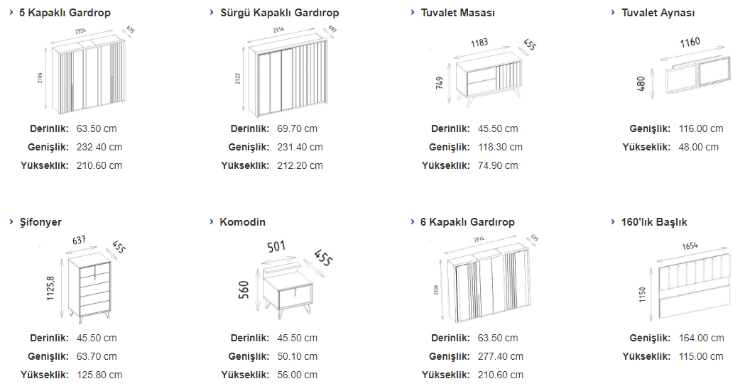 •  5 Kapılı, 6 Kapılı ve Sürgü Kapılı olmak üzere 3 gardırop alternatifi bulunmaktadır.