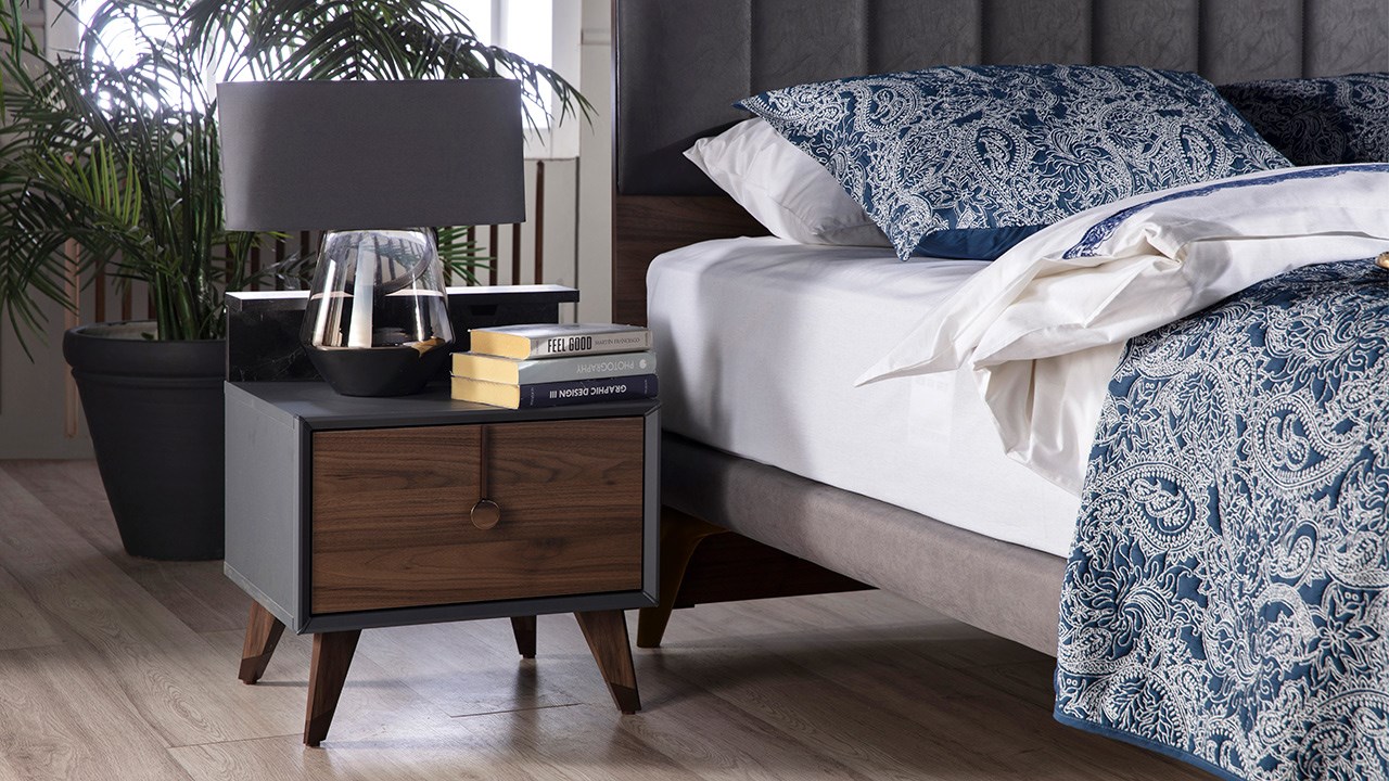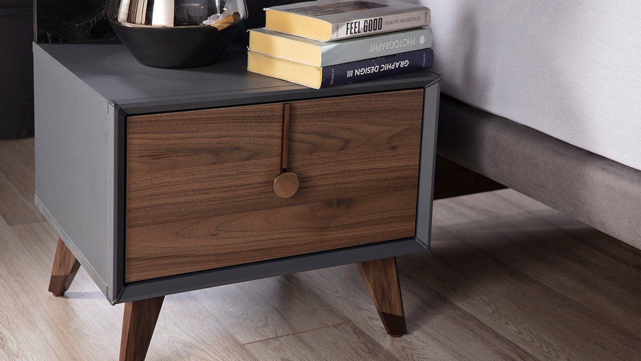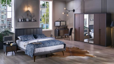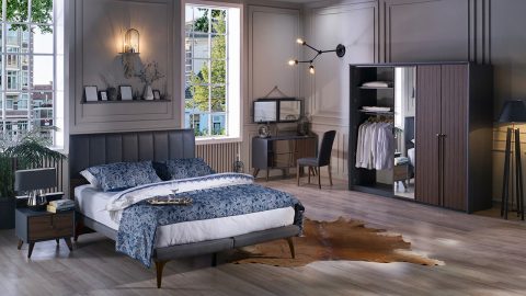 Liva Yatak Odası Takımı renk konfigürasyonunda ceviz renk kullanılmış olup, tonları ile desteklenerek tasarım görsel açıdan zenginleştirilmiştir.