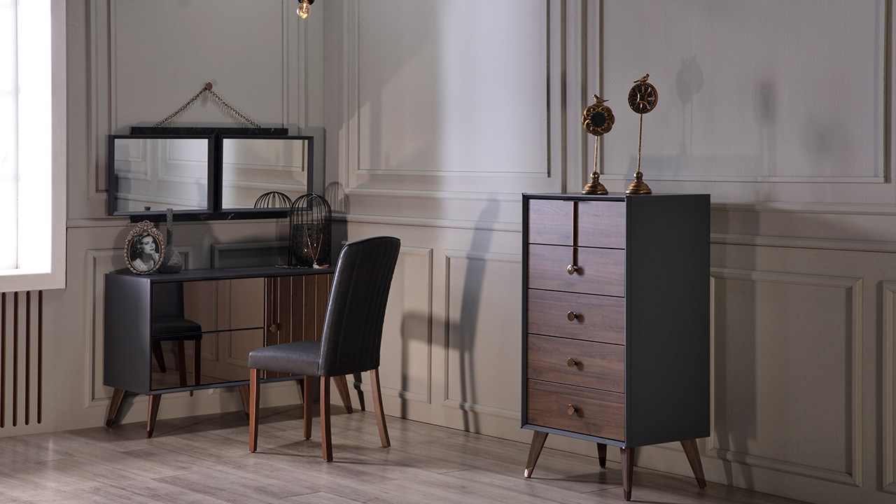 •  Liva Yatak Odası Takımı renk konfigürasyonunda ceviz renk kullanılmış olup, tonları ile desteklenerek tasarım görsel açıdan zenginleştirilmiştir.